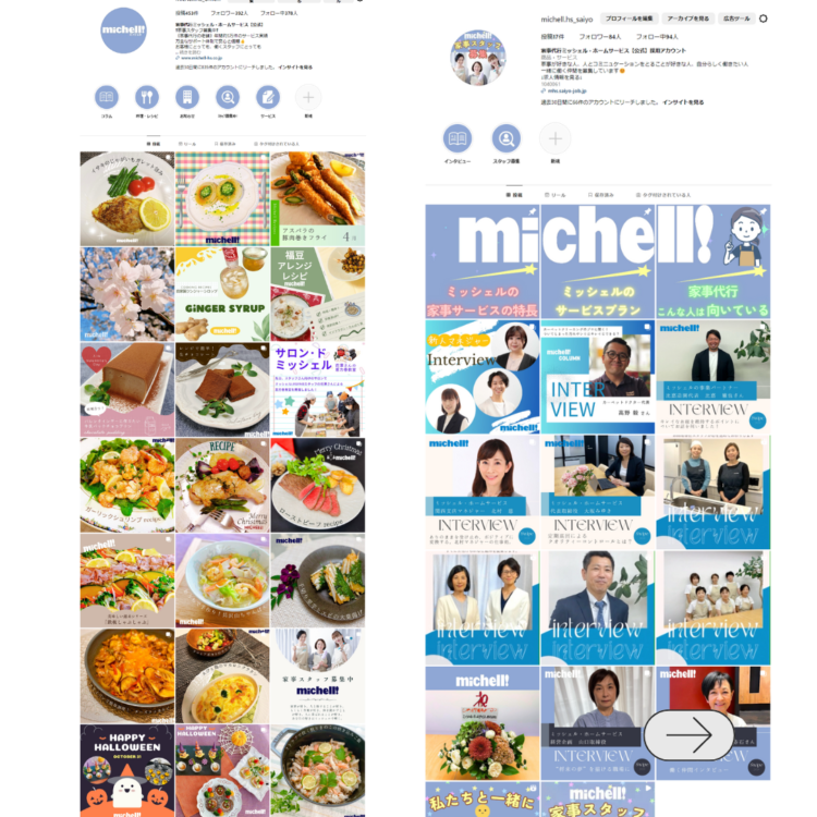 半田:まず、インスタグラムの更新です。公式アカウントと採用専用のアカウントの2つを使い分けているのですが、公式アカウントは、スタッフさんが作ったお料理レシピを中心に、ミッシェルのブランドイメージを訴求するために適宜更新しています。採用アカウントはホームページの“家事のコンシェルジュ・ノート”との連動記事や、お仕事を探している人向けの内容をアップし、スタッフの新規採用と紐付ける目的で運用しています。