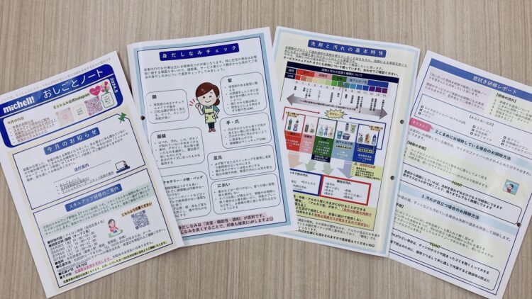 半田:外部発信の他、インナー向けの情報ツールの制作も担当しています。隔月で発行しているスタッフさん向けの “おしごとノート”です。お掃除技術の情報、実際にあったクレームや注意喚起、スキルアップ研修の募集案内など、その都度お知らせしたいことを掲載しています。スタッフさんは、一人で作業に入ることが多く、横のつながりや情報共有が限られているため、このような媒体を使ってコミュニケーションを図ることも大切なんです。