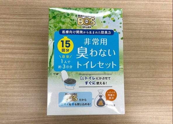 防臭力に優れているBOSの〈非常用臭わないトイレセット〉。本のように立てれば省スペースで収納可能。ミッシェル本社でもストックされていた。