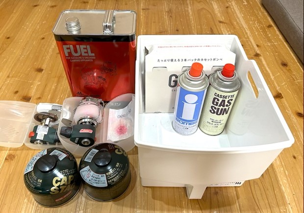 キャンプで使っているランタンと簡易コンロ。ホワイトガソリンやガスボンベなどの燃料も一緒に備蓄している。保管場所は細心の注意を払うこと。