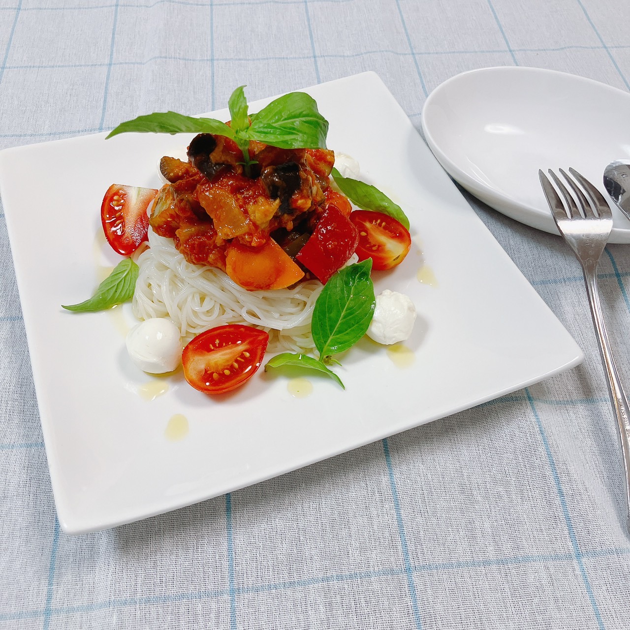 - お皿に素麺を盛りラタトゥイユをのせ、モツァレラチーズ、バジルで飾って完成