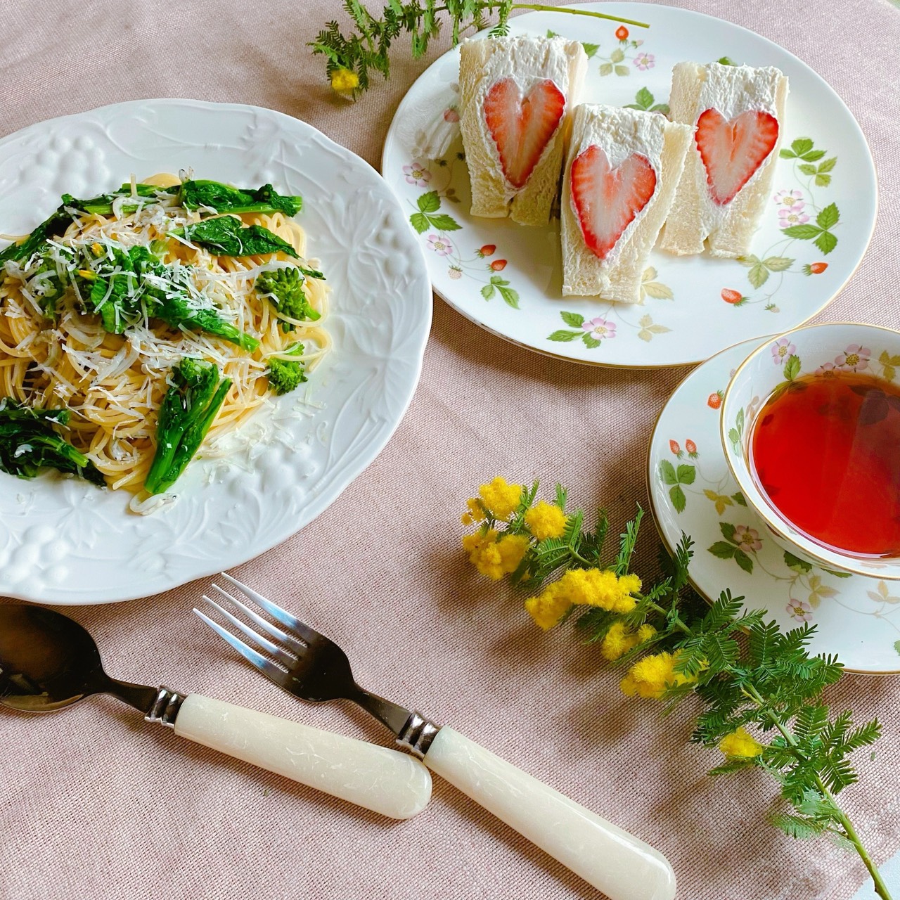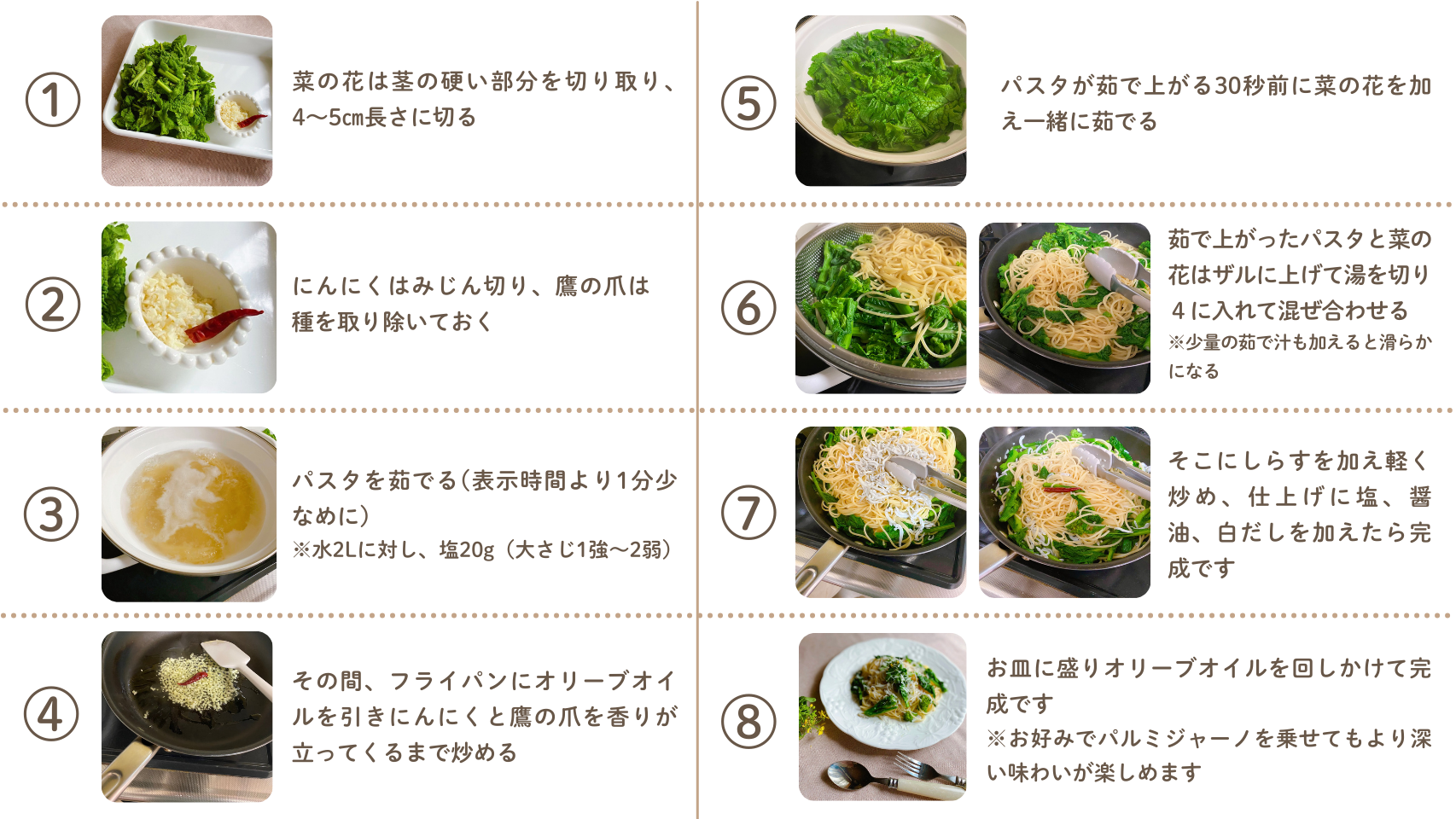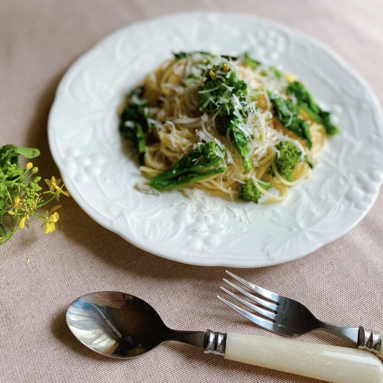 - パスタが茹で上がる30秒前に菜の花を加え一緒に茹でる