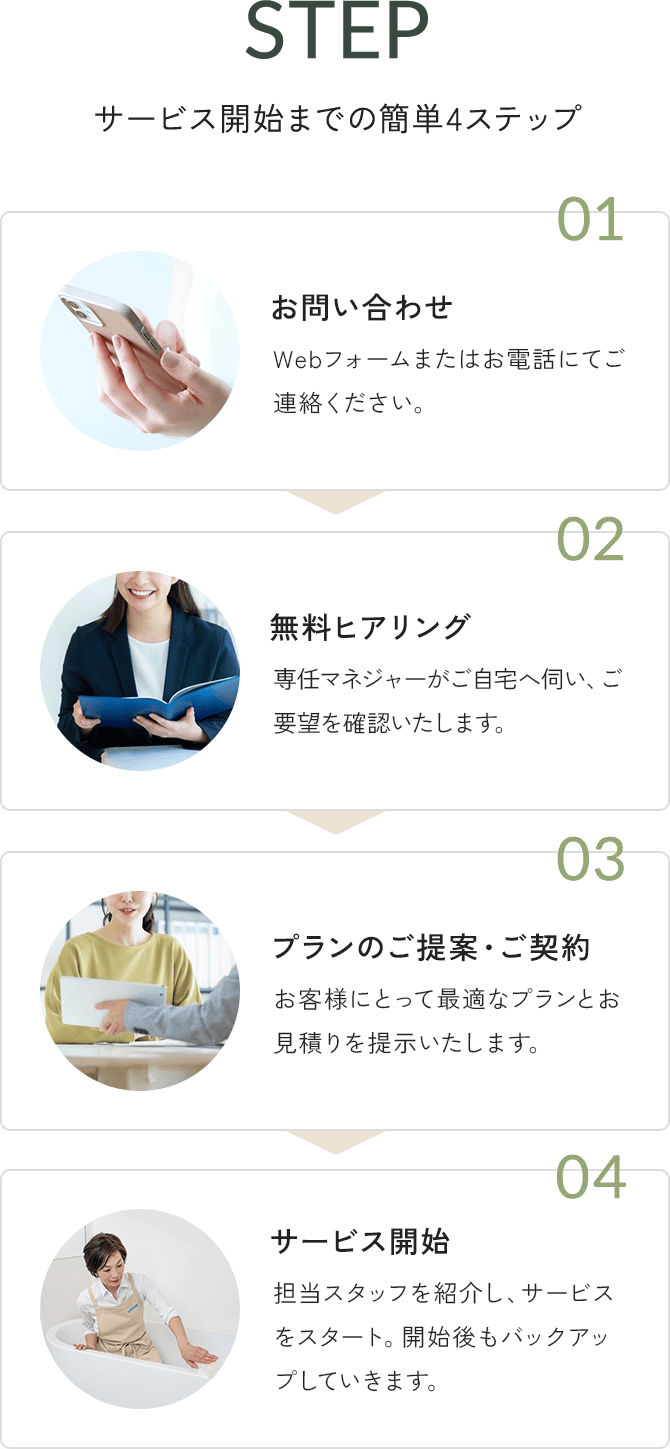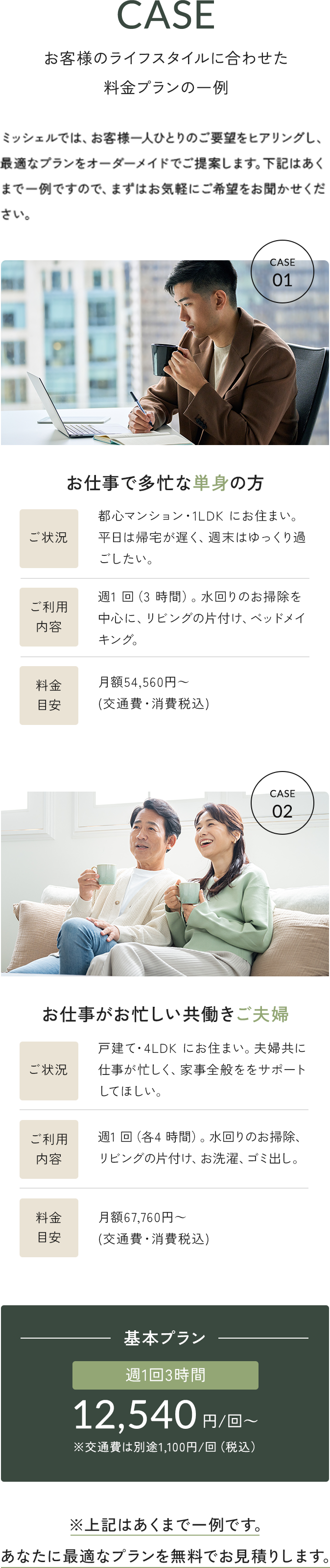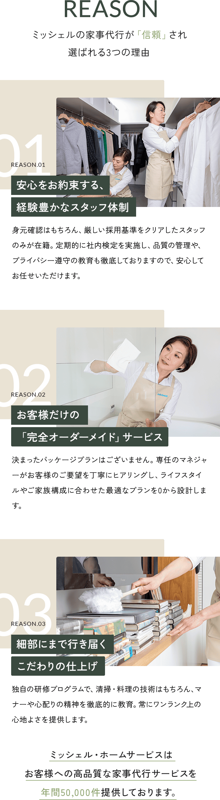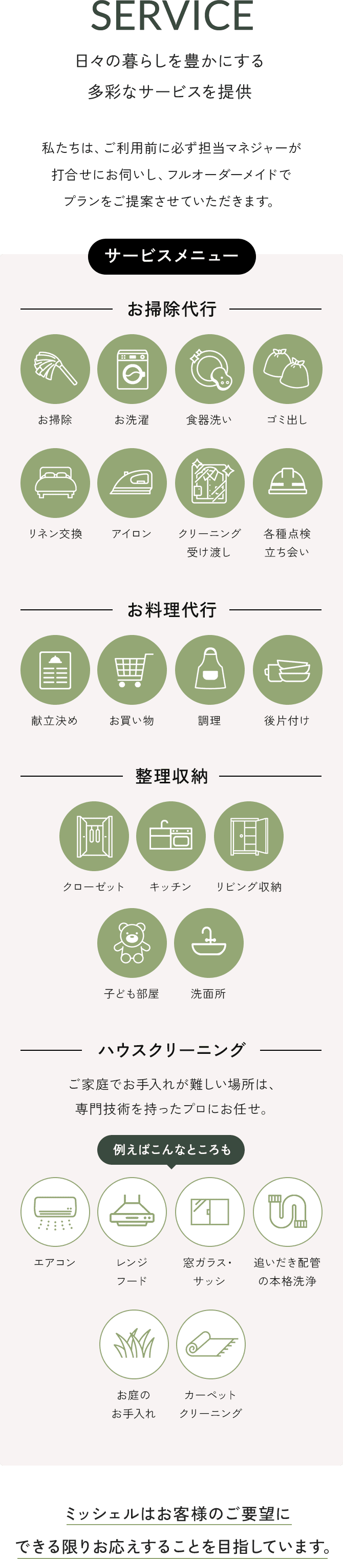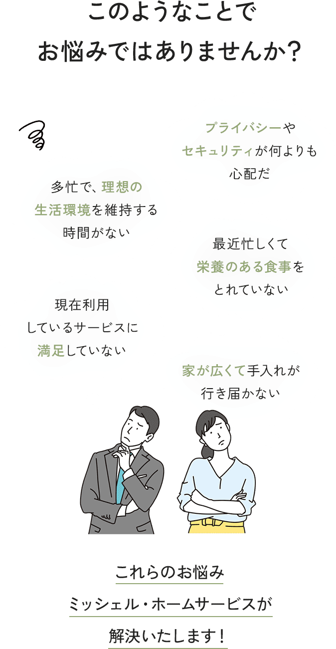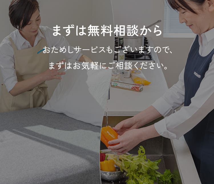 現在ご契約中のお客様の半数以上がご不在時にご利用いただいております。鍵のお預かりについては、採用時に身元確認などの厳しい審査をクリアしたスタッフが、ミッシェルの規定に基づき厳重に管理しています。 ※おためしサービス、お片付けサポートご利用の場合は在宅をお願いしております。